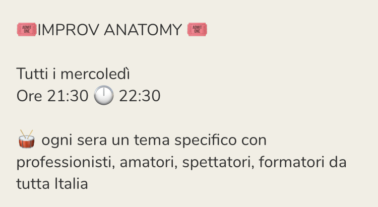 Ogni mercoledì alle 21.30 curo con Antonio de Santo una stanza su Clubhouse – un’ora insieme per parlare di improvvisazione nelle sue mille declinazioni, ogni settimana ospiti professionisti, amatori, spettatori, formatori da tutta Italia!